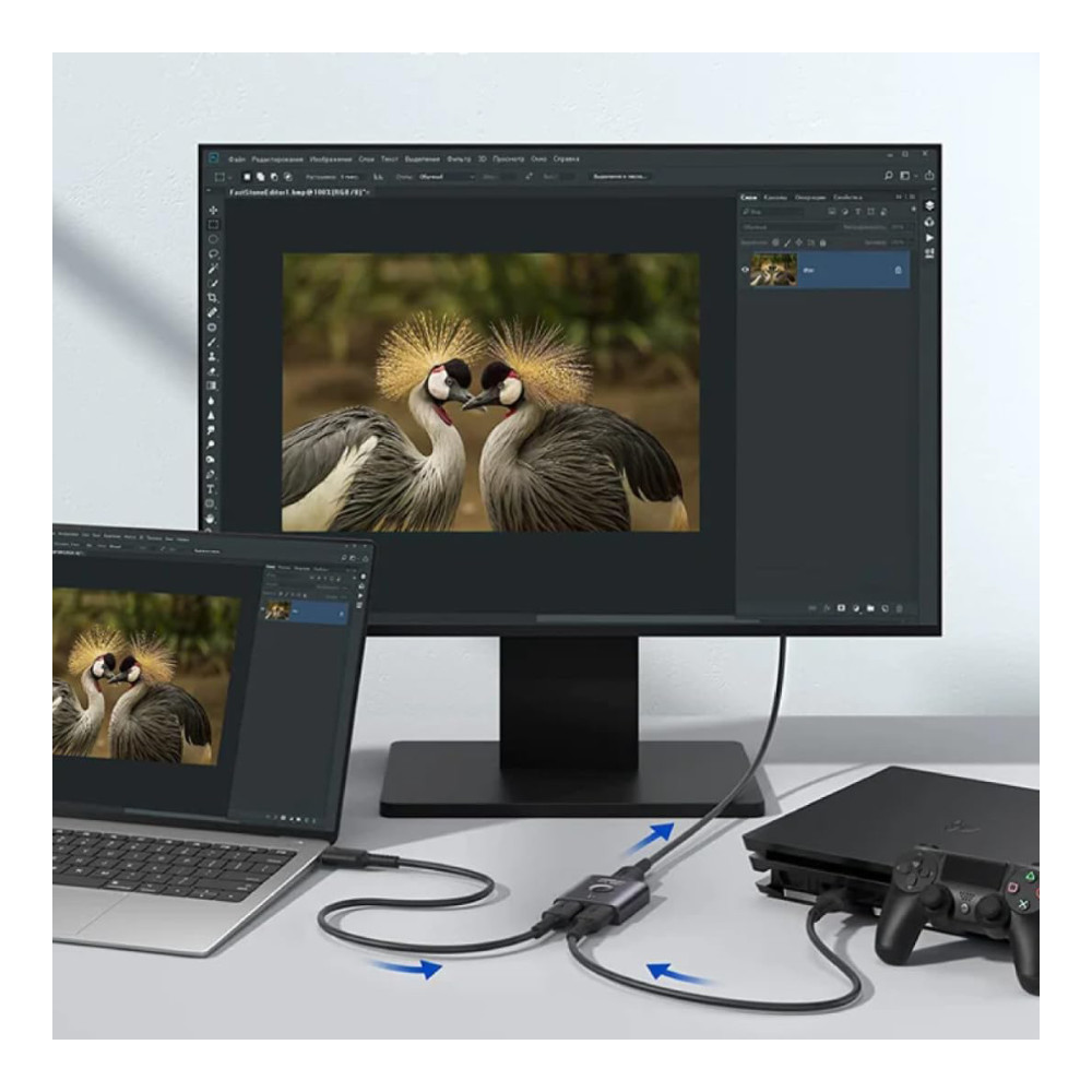 – Seamlessly switch between two HDMI sources with the press of a button
